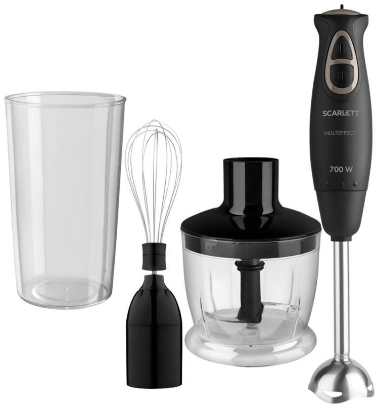 Блендер Scarlett SC-HB42F55 выполнен в виде функционального набора с основной насадкой-ножкой, венчиком и измельчителем. Это делает его незаменимым приобретением для хозяйки, которая любит радовать семью разными блюдами. Устройство мощностью 700 Вт быстро справляется с посильными ему задачами. Блендер работает на двух скоростях, используя для управления дву кнопки на верхней части корпуса.