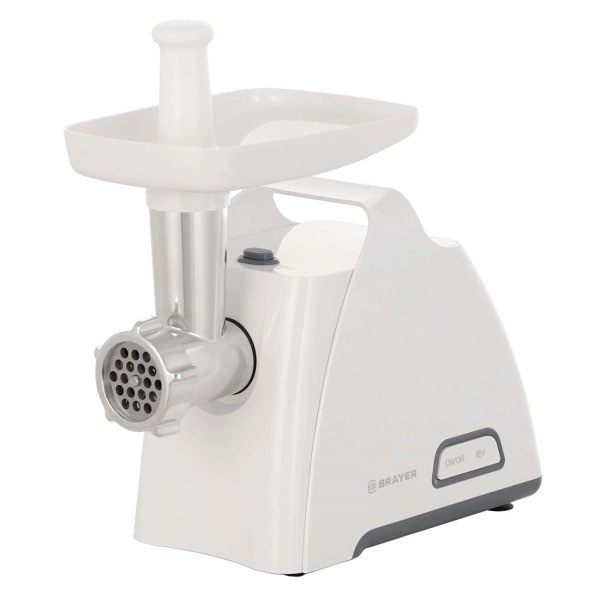 Электромясорубка Brayer BR1604 за минуту превратит в фарш до 2 кг мяса. Консистенция готового продукта регулируется с помощью дисков с отверстиями разного размера. ДОПОЛНИТЕЛЬНЫЕ ВОЗМОЖНОСТИ В комплект входят овощерезка, тёрка и шинковка, которые пригодятся, чтобы подготовить ингредиенты для салата и супа. Также вы получите насадки, позволяющие делать сосиски-кеббе, внутрь которых можно класть различную начинку. ПРОСТО ПОЛЬЗОВАТЬСЯ У этой модели – один скоростной режим. Застрявший шнек легко освобождается, достаточно лишь задействовать функцию «Реверс». УДОБСТВО И НАДЁЖНОСТЬ На корпусе есть ручка для переноски. Устойчивость обеспечивается прорезиненными ножками. Двигатель автоматически отключается при перегреве.